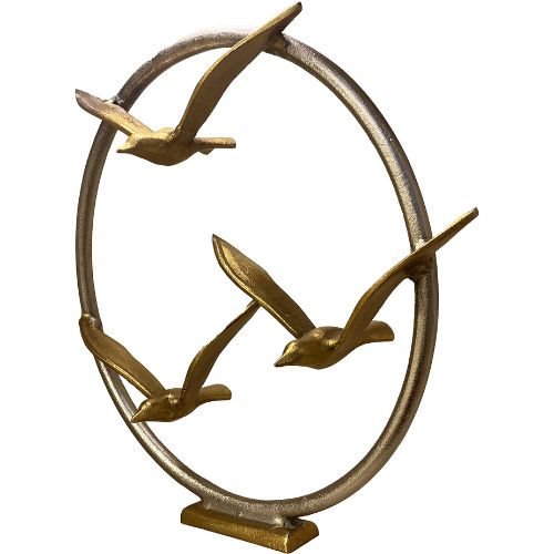 Featuring three golden birds in flight within a stylish circular frame, this piece